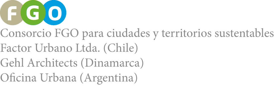 El Consorcio FGO para ciudades y territorios sustentables está conformado por tres empresas: Factor Urbano Ltda. con base en Santiago de Chile especialista en planificación y gestión urbana integrada; Gehl Architects con base en Copenhague, Dinamarca especialista en arquitectura, diseño y planificación sustentable y Oficina Urbana S.A. con base en Buenos Aires, Argentina especialista en proyectos urbanos estratégicos.